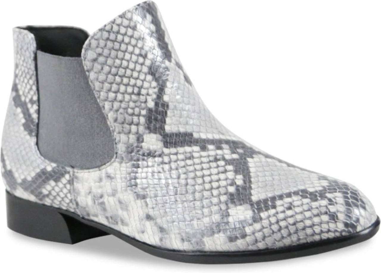- The upper is snake print suede with a wide grey band gore and zipper