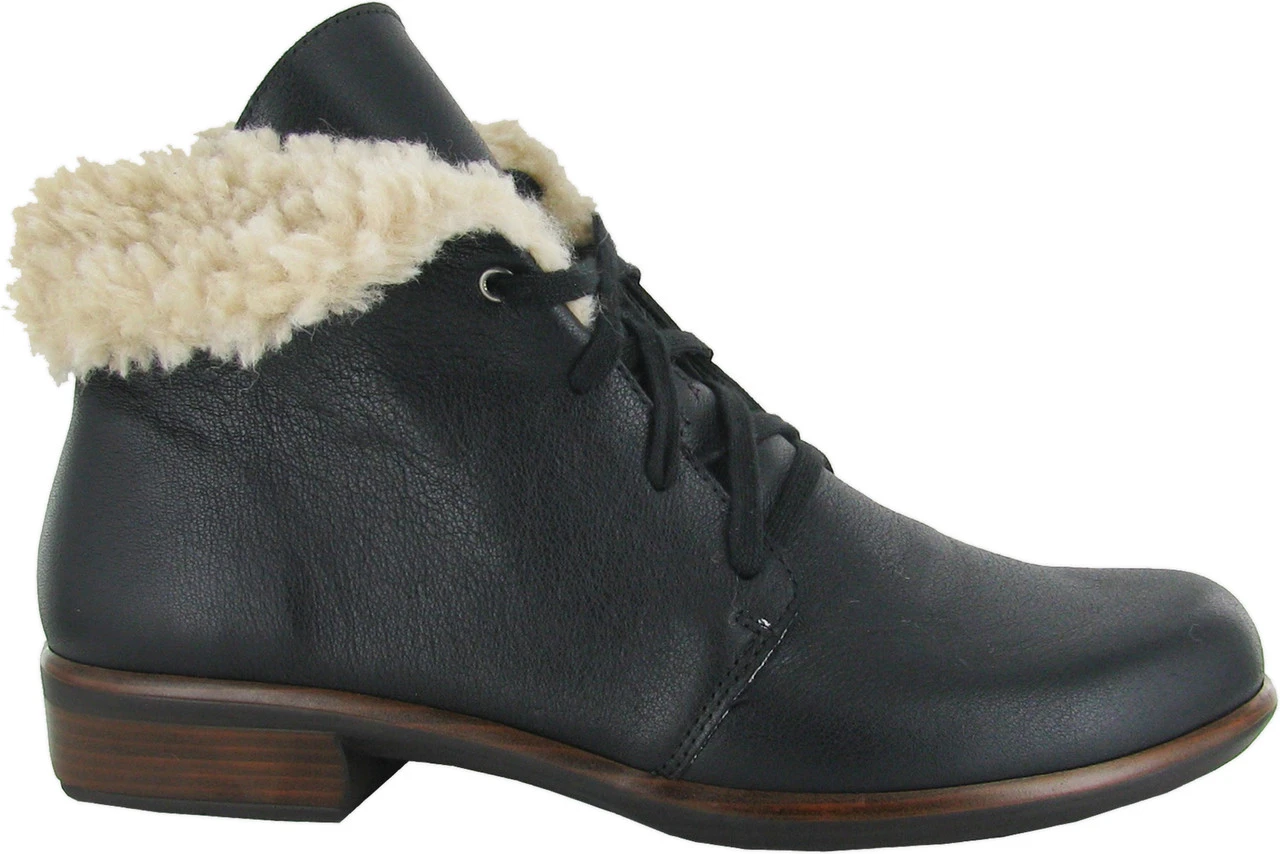 Englin’s Fine Footwear presents the women’s ‘Pali’ from Naot. Smooth leather, faux shearling cuff and lace up closure that make these ankle boots irresistible. The Pali is a stylish bootie and it features Naot’s removable, anatomic cork & latex footbed for all day comfort. The Aura Collection features a 1.5″ polyurethane sole with a metal shank which is extremely lightweight, durable & abrasive to prevent slipping. This collection uses a hand-sewn Strobel construction making it strong and extremely flexible.