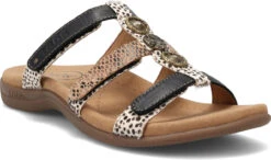 Englin’s Fine Footwear presents the women’s ‘Prize 4’ from Taos. The Prize 4 is a premium leather slide sandal with 3 bands of hook and loop straps offering complete adjustability. Pounded medallion hardware accent the multi-colored strappy upper offering a stylish, versatile look. Featuring an embossed microfiber footbed that is treated with an antimicrobial shield, keeping your feet cool and dry, with soft, cooling gel padding on top of polyurethane for maximum shock absorption. The outsoles are flexible, durable rubber.